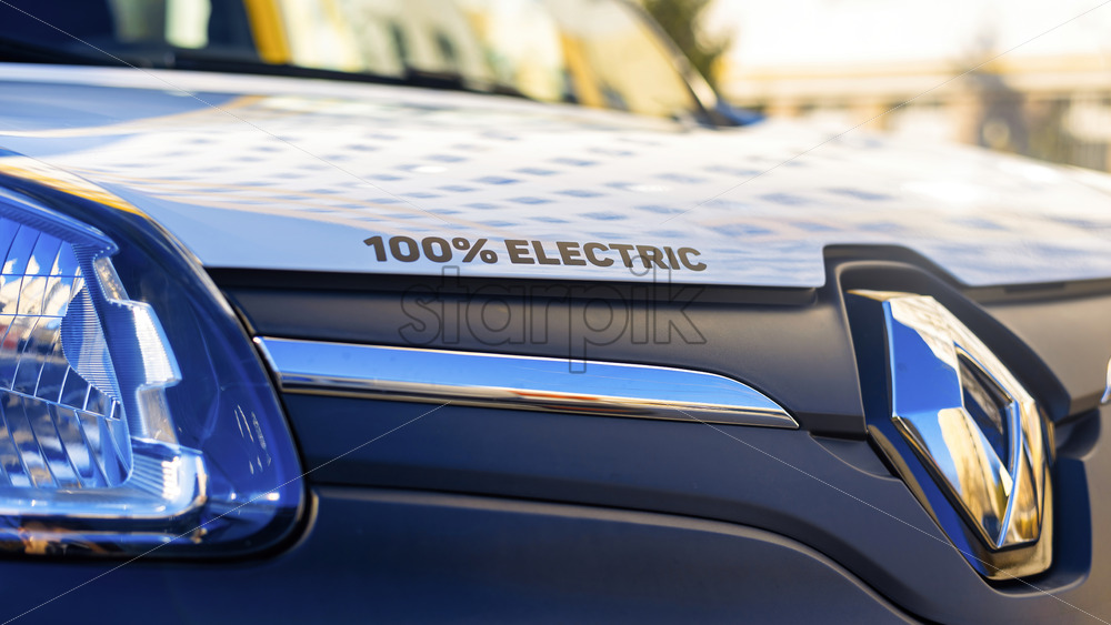 CHISINAU, MOLDOVA – NOVEMBER 3, 2021: Logo and 100% Electric inscription on the nose of Renault Kangoo