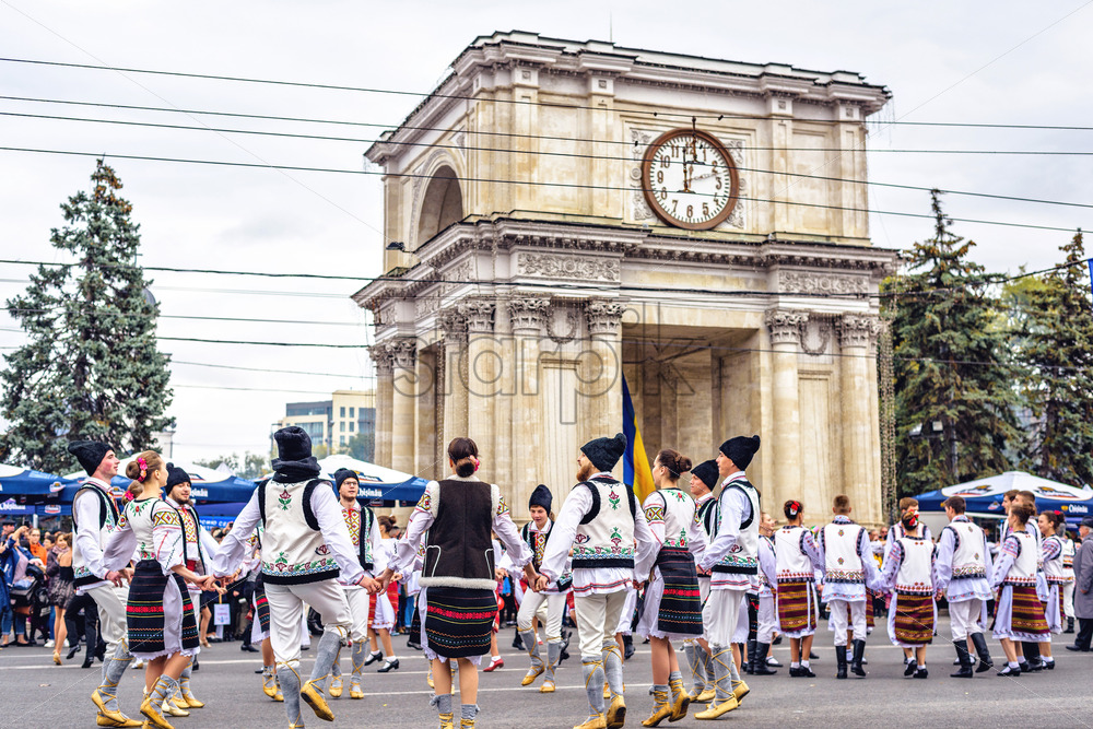 Home » Shop » photo » CHISINAU, MOLDOVA – OCTOBER 14, 2017: People dancing national Hora dance near Arch of Triumph at city day. Clouds on background