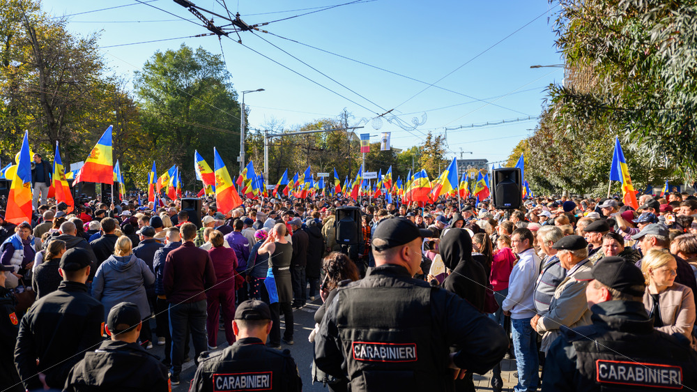 CHISINAU, MOLDOVA – OCTOBER, 2022: Mass meeting in the center of the city. Protesters with flags, police