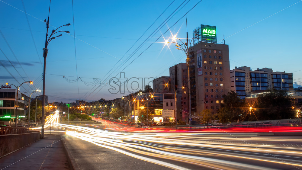 CHISINAU, MOLDOVA – SEPTEMBER 25, 2020: Street view, long exposure, car’s light traces, a lot of illumination and residential buildings