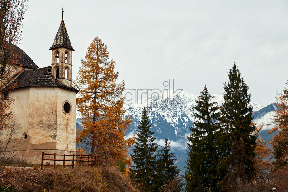 Church and colorful autumn forest with mountains covered in snow on background. Trento, Italy