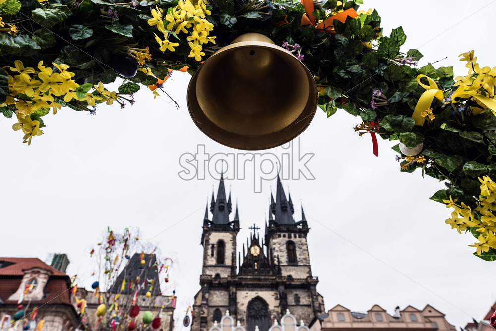 Church of Our Lady before Tyn and colorful spring flowers arch. Cloudy and dramatic sky on background. Prague, Czech Republic