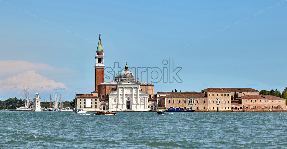 Aerial drone view of Venice, Italy. Water channels with floating boats, historical city centre with old residential buildings and narrow streets, land in the distance