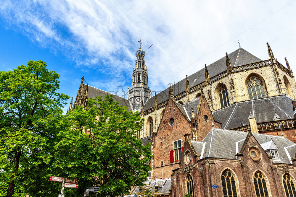 Church of St. Bavo from bottom in a sunny day. Bright blue sky with clouds on background. Negative copy space, place for text. Haarlem, The Netherlands