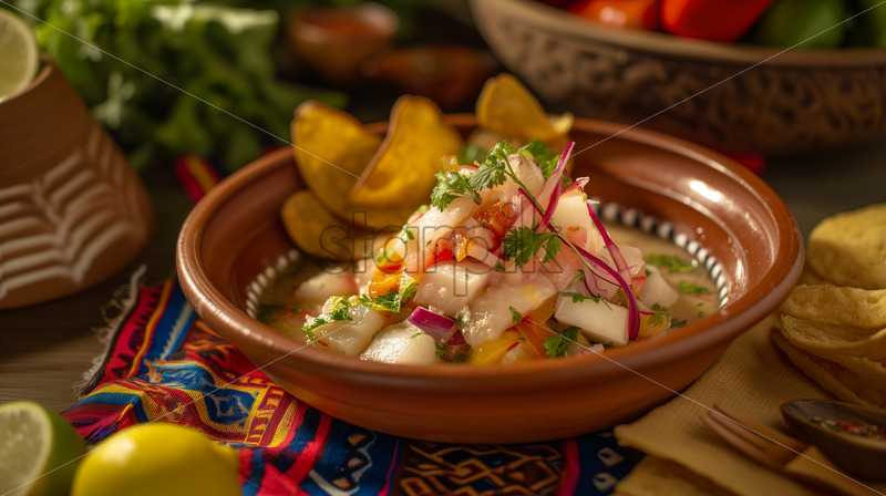 Vibrant shot captures zesty ceviche with citrus-cured fish, lively garnishes, plantain chips, set in coastal elegance.