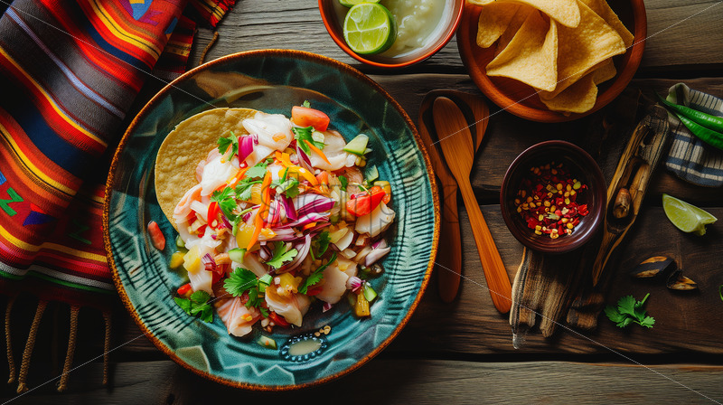 Peruvian ceviche, featuring fresh fish cured in citrus juices and adorned with colorful garnishes, served alongside crispy plantain chips.