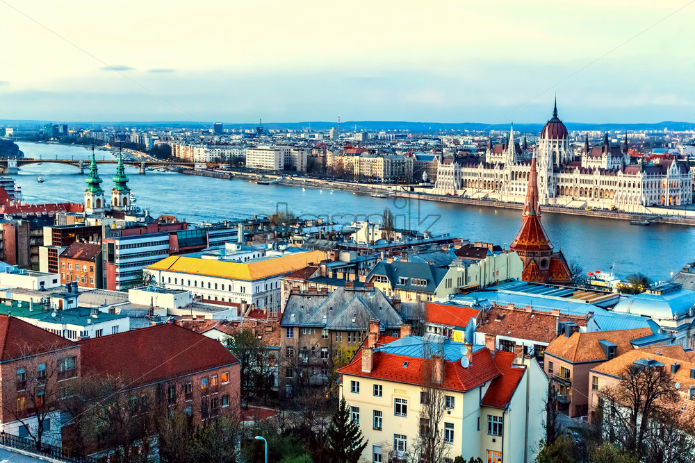 City and Danube River at sunset. Blue cold sky on background and warm sunlight reflecting on buildings. Parliament on background. Negative copy space, place for text. Budapest, Hungary Royalty Free Stock photo