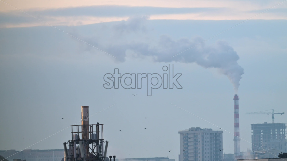 Urban skyline with residential buildings and an industrial chimney emitting smoke at sunset