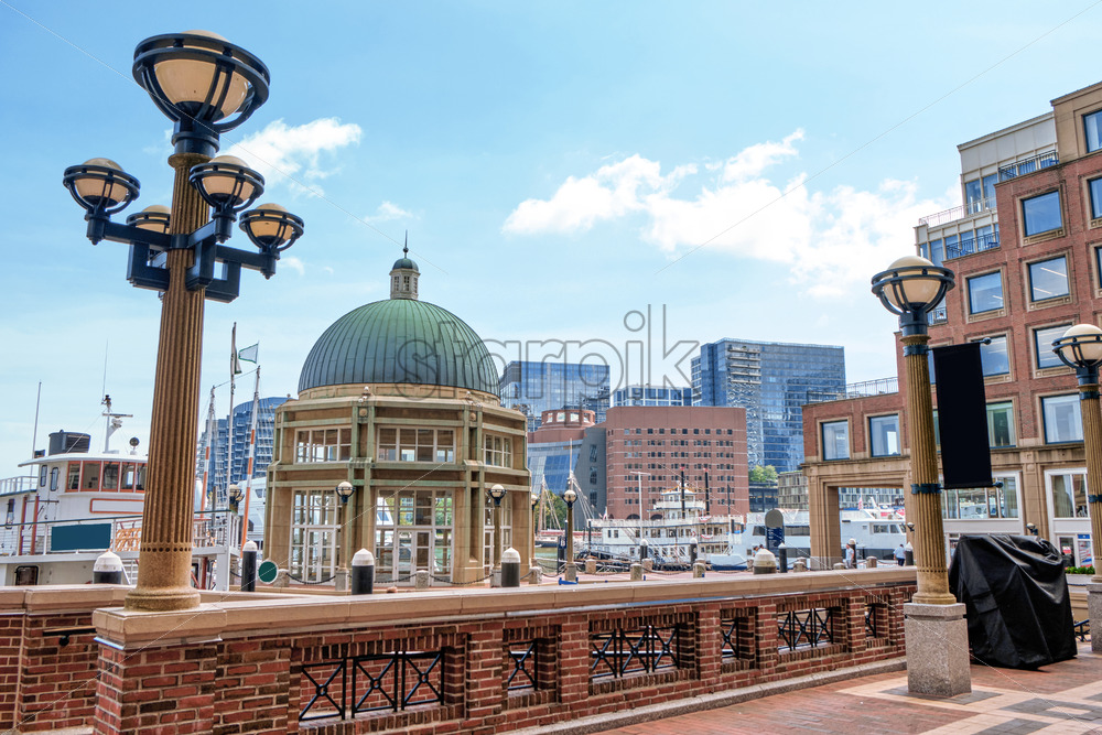 Cityscape in Boston with moored ships in the foreground and modern buildings in the background, the weather is sunny and clear