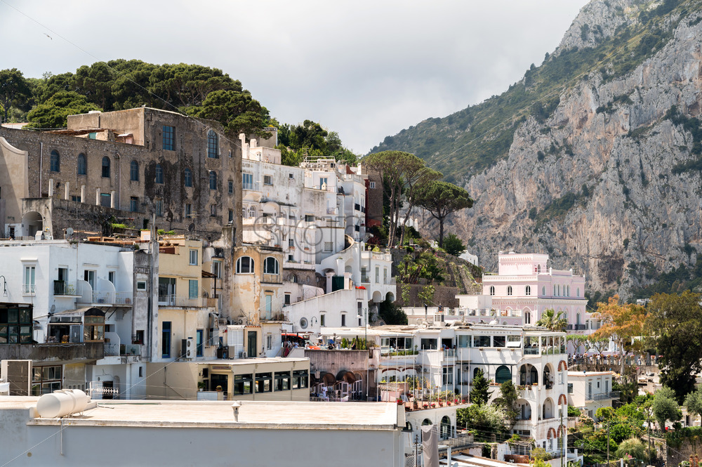 POSITANO, ITALY – JUNE, 2022: Street scape of the town located on the Tyrrhenian sea coast. Rows of residential buildings, church with people in front of it, greenery