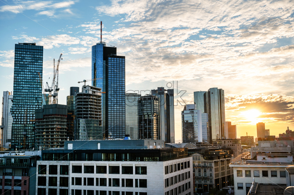 Cityscape of Frankfurt downtown at sunset, Germany. Multiple skyscrapers, residential and office buildings