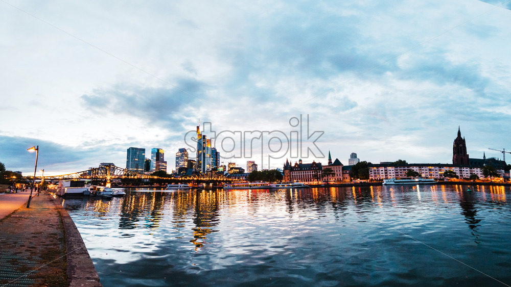 Cityscape of Frankfurt downtown at sunset, Germany. River Main with moored boats, skyscrapers with illumination on the background