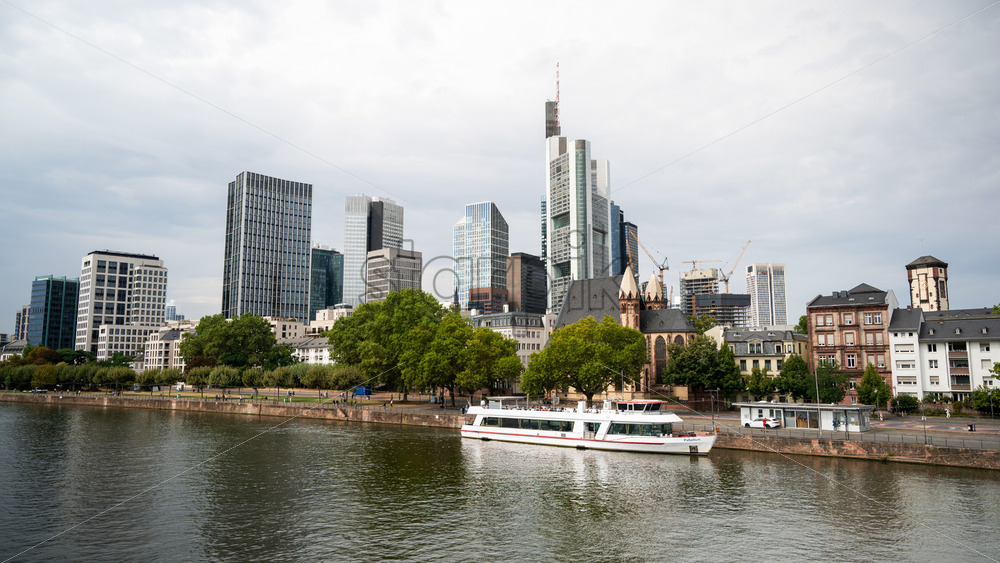 Cityscape of Frankfurt downtown, Germany. River Main with a bridge and moored boat, skyscrapers on the background, other buildings