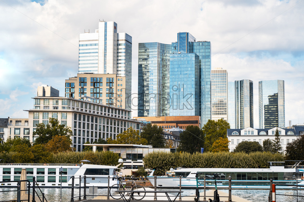 FRANKFURT, GERMANY – SEPTEMBER, 2022: Cityscape of the city from a bridge over the River Main, greenery, people, buildings and skyscrapers in the distance