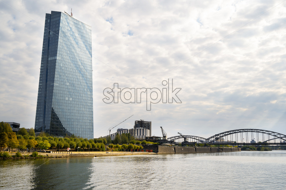 Cityscape of Frankfurt downtown, Germany. River Main with bridge, skyscraper and other buildings around
