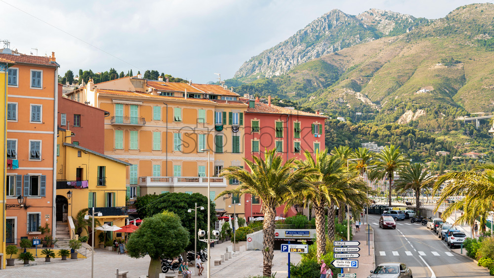 MENTON, FRANCE – SEPTEMBER 5, 2021: Cityscape of the town. Traditional residential buildings, road with cars, greenery