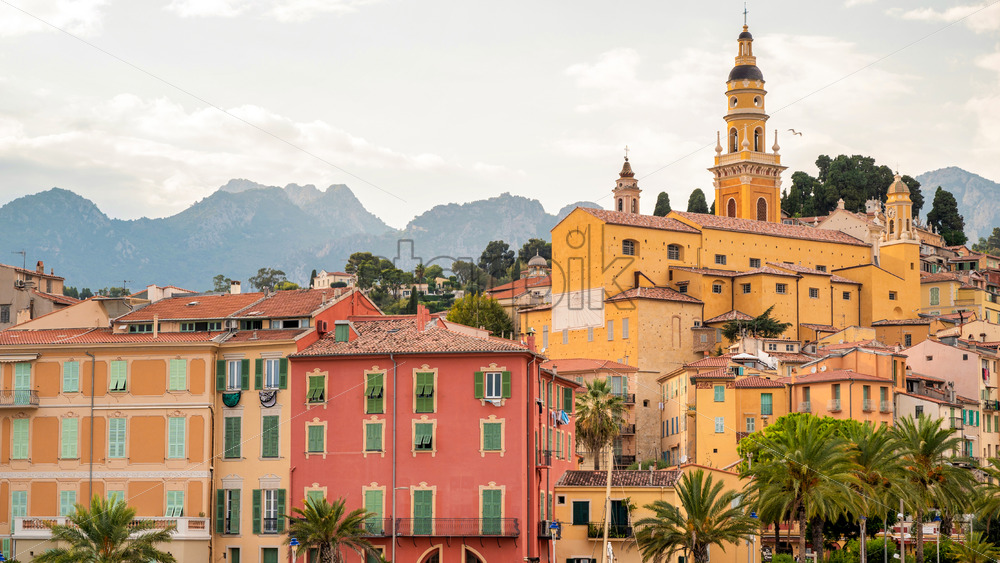 Cityscape of Menton, France. Traditional residential buildings, Basilica St. Michel