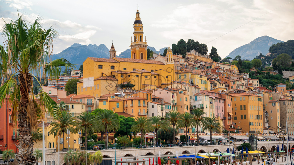 Cityscape of Menton, France. Traditional residential buildings, Basilica St. Michel, embankment street