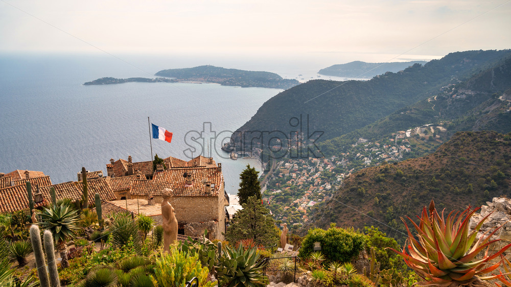 Cityscape of Menton, France. Roofs of traditional residential buildings with national flag, sea coast on the background