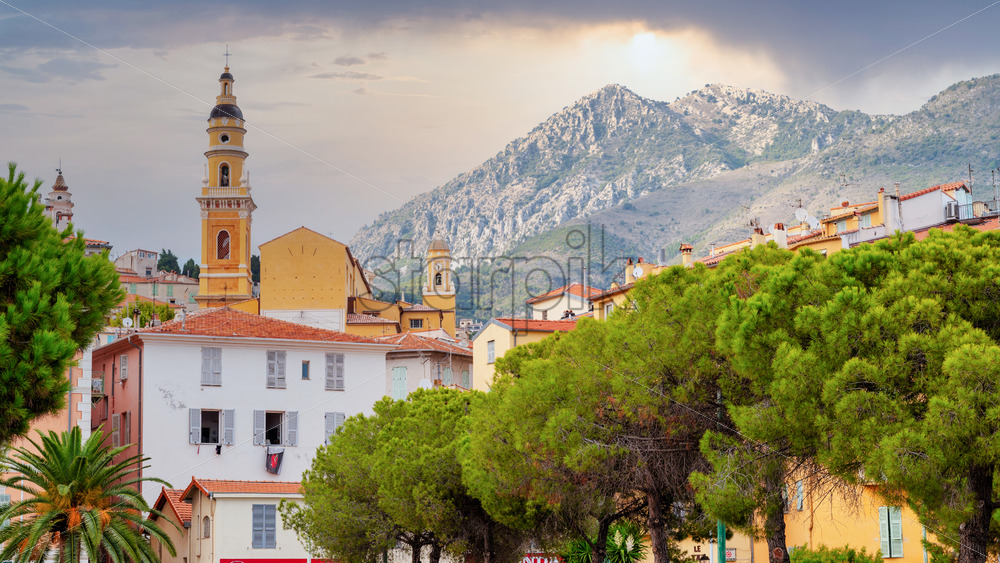 Cityscape of Menton, France. Traditional residential buildings, greenery, Basilica St. Michel