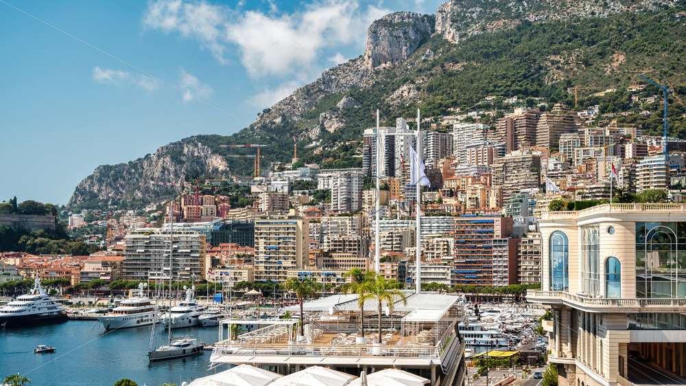 Cityscape of Monaco. Sea port with moored yachts, multiple buildings, greenery, hills