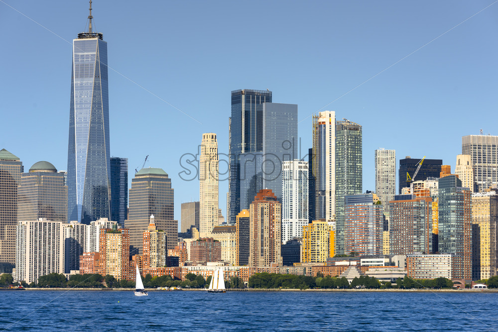 Cityscape of New York from Liberty Island, USA. Manhattan, multiple skyscrapers, floating yachts