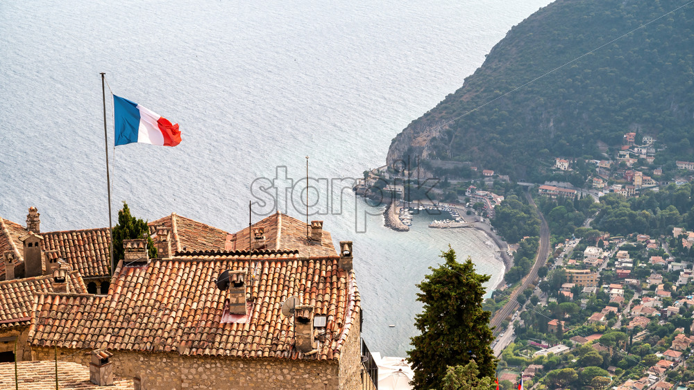 Cityscape of the Menton, France. Roofs of traditional residential buildings with national flag, sea coast on the background