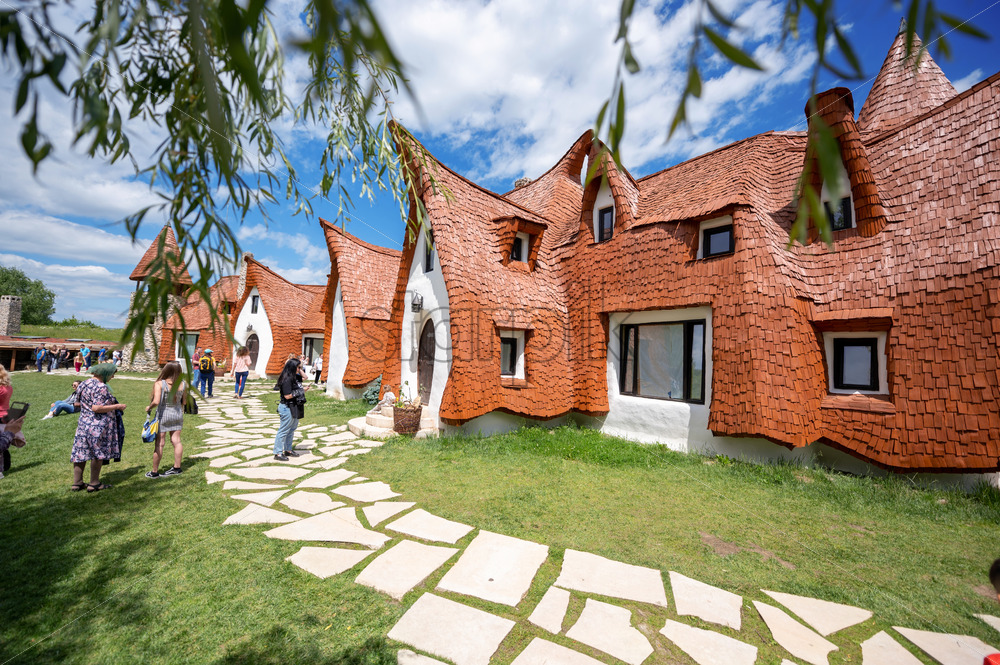 PORUMBACU DE SUS, ROMANIA – MAY, 2022: Clay Castle, Fairy Valley, a lot of walking tourists, greenery