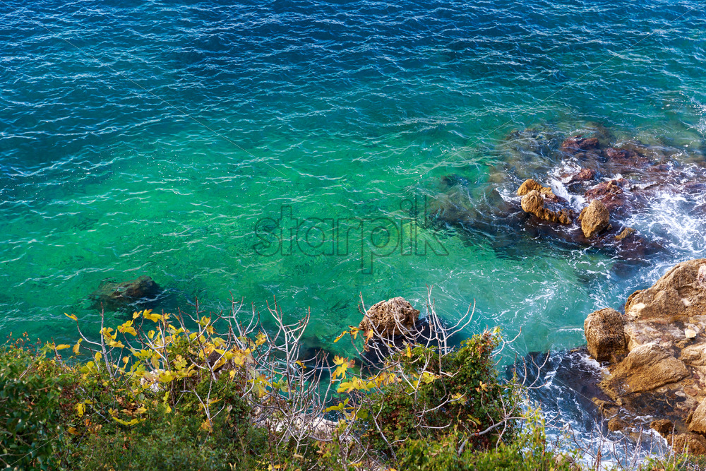 Home » Shop » photo » Clear sea shore with rocks and green and blue waters in Nice, France