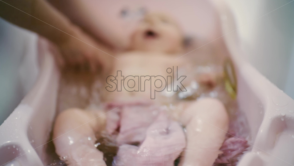 Close up of a baby bathing in a small infant tub with gentle water movement
