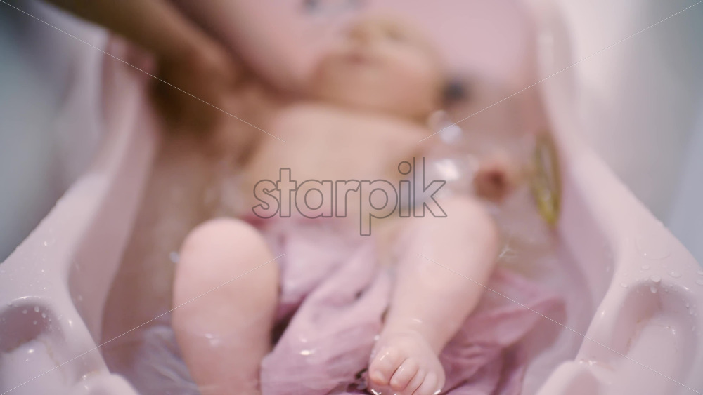 Close up of a baby bathing in a small infant tub with gentle water movement