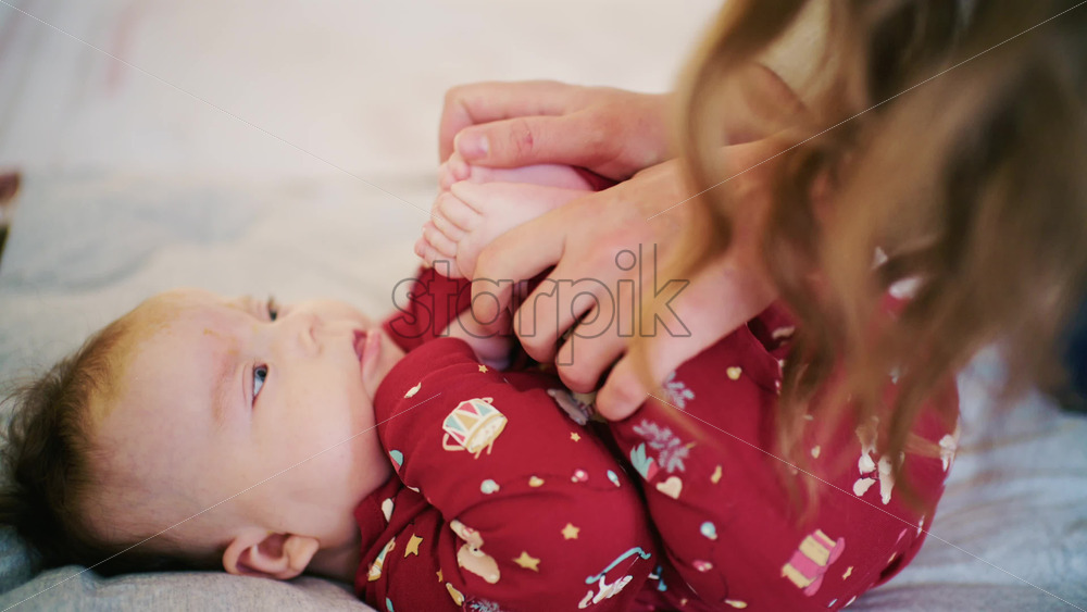 Side view of a newborn baby lying calmly on a soft bed wearing patterned pajamas with the mom tickling and playing with her