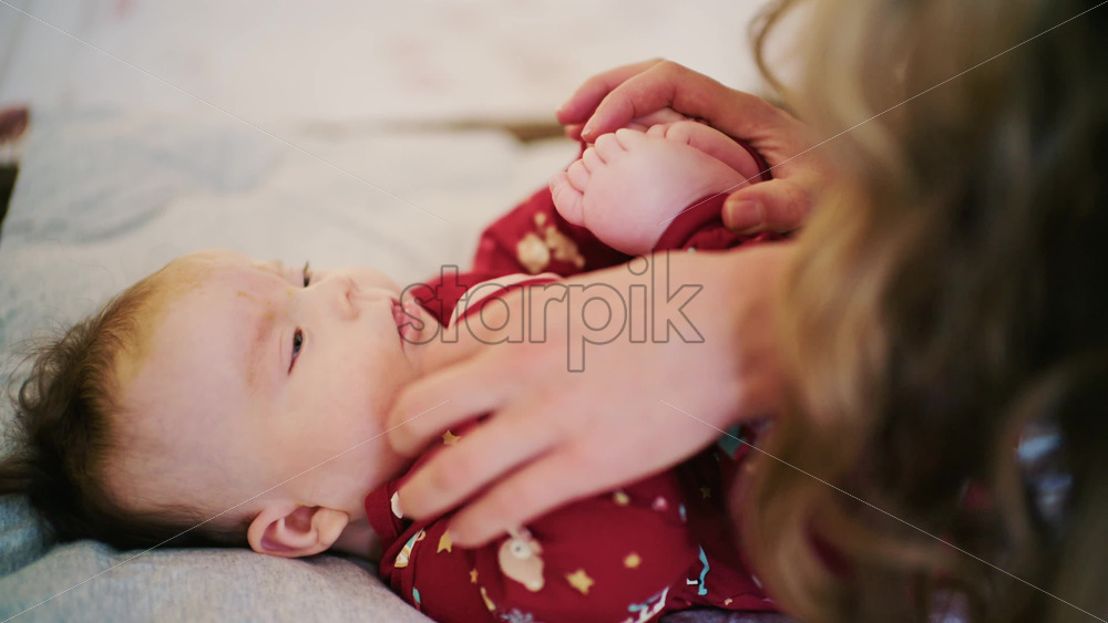 Close up of a baby in a red onesie lying on a bed while the mother is doing mobility exercises
