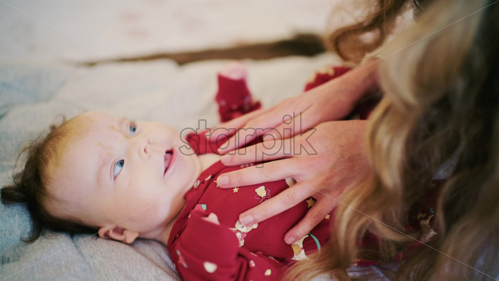 Close up of a baby in a red onesie lying on a bed while the mother is doing mobility exercises