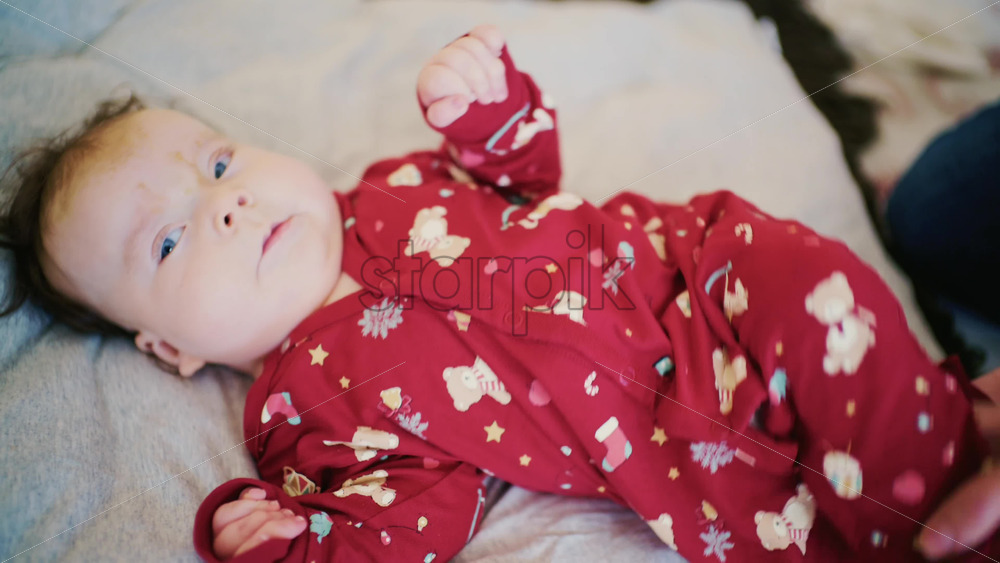 Side view of a newborn baby lying calmly on a soft bed wearing patterned pajamas with the mom tickling and playing with her