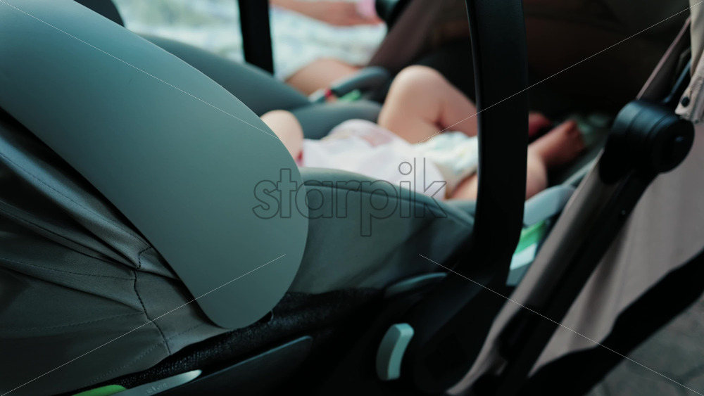 Close up of a baby wearing a pink outfit, peacefully sleeping in a stroller Royalty Free Stock Video Footage