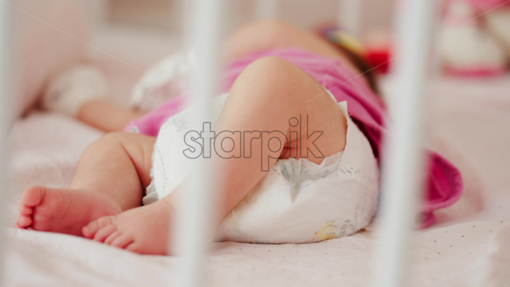 Close up of a baby’s legs and diaper as the infant rests in a crib, seen through the crib bars Royalty Free Stock Video Footage