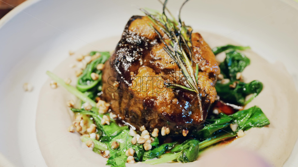 Close up of a beautifully plated beef filet, topped with a golden crust and garnished with rosemary Royalty Free Stock Video Footage