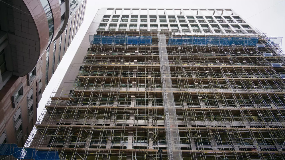 Close-up of a building facade covered in scaffolding and protective mesh during construction or renovation. London, England Royalty Free Stock Video Footage