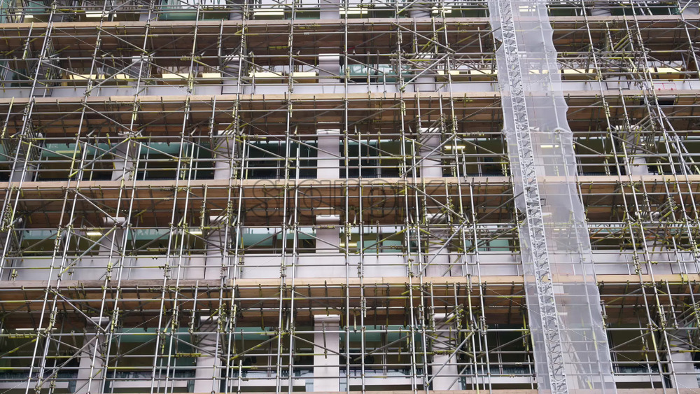 Close-up of a building facade covered in scaffolding and protective mesh during construction or renovation Royalty Free Stock Video Footage