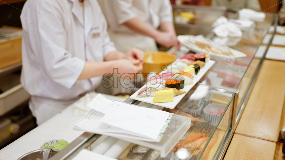 Close up of a chef preparing nigiri on a white plate at the Tsukiji Fish Market in Japan Royalty Free Stock Video Footage