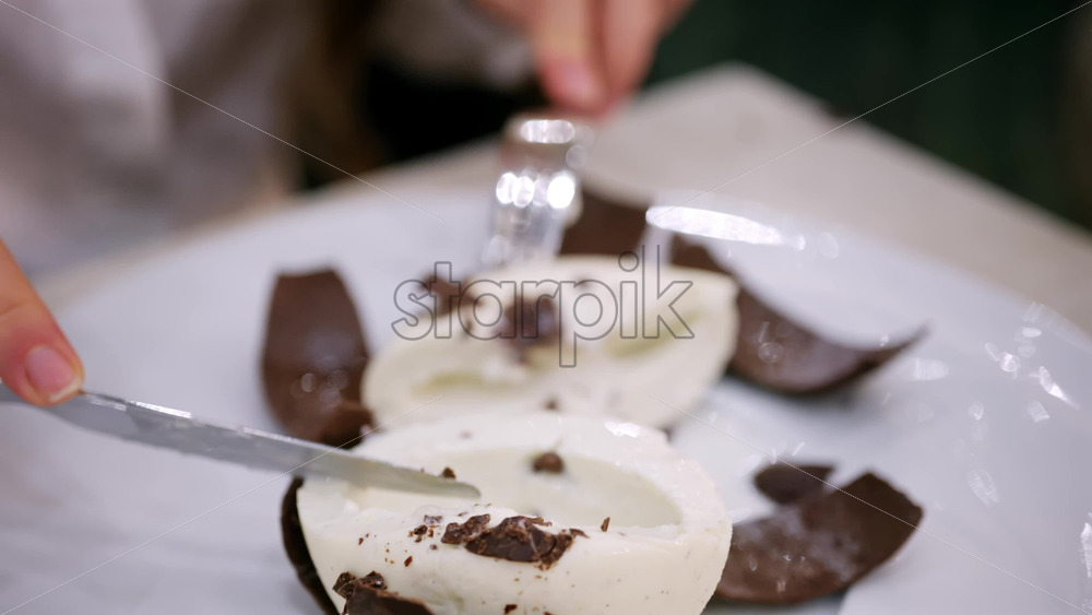 Close up of a coconut shaped dessert with a chocolate shell being cut open to reveal a creamy interior