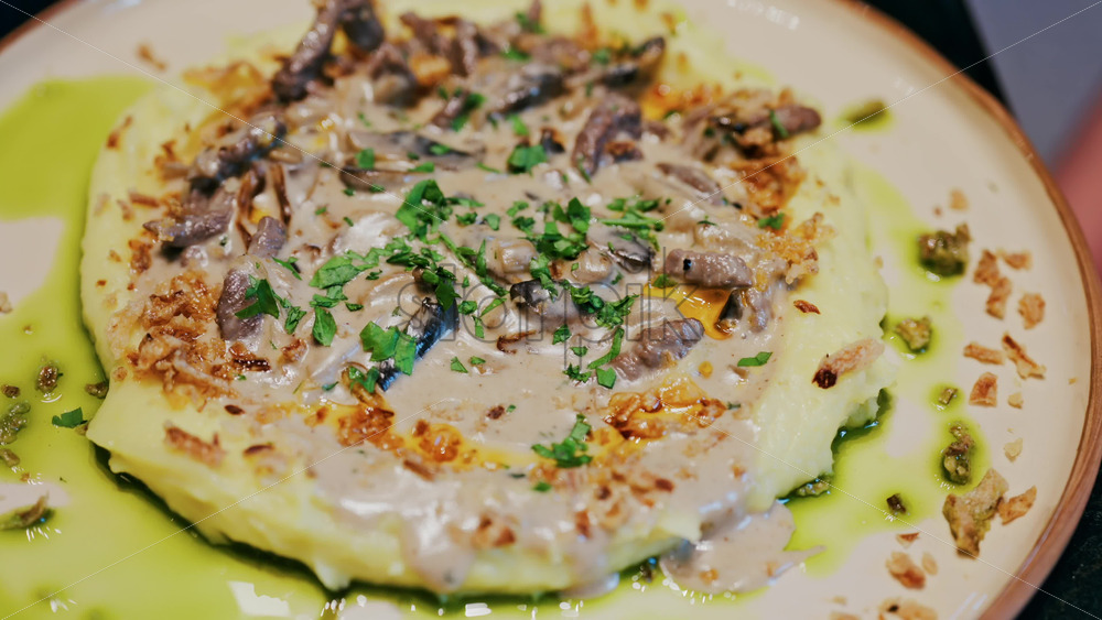 Close up of a woman’s hand cutting into a gourmet meat dish served with sauce, greens, and rosemary garnish on a white plate Royalty Free Stock Video Footage