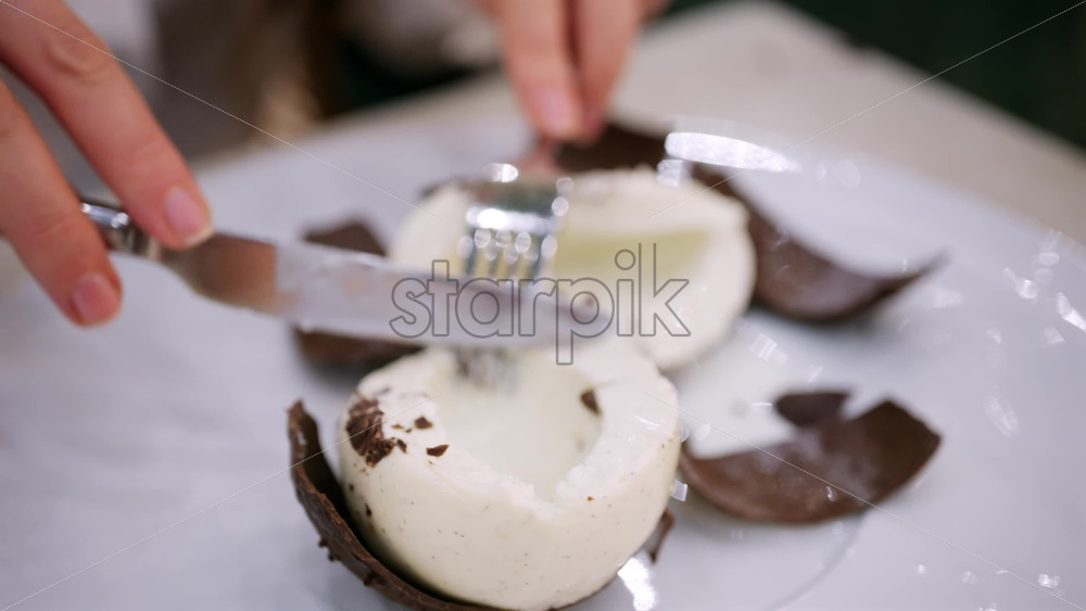 Home » Shop » 1 Video » Close up of a dessert shaped like a coconut being opened with a fork, revealing a creamy white interior