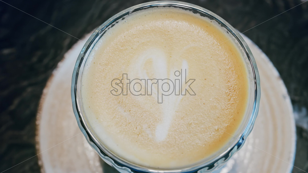 Close up of a glass cup with a latte at a cafe. Vertical Royalty Free Stock Video Footage
