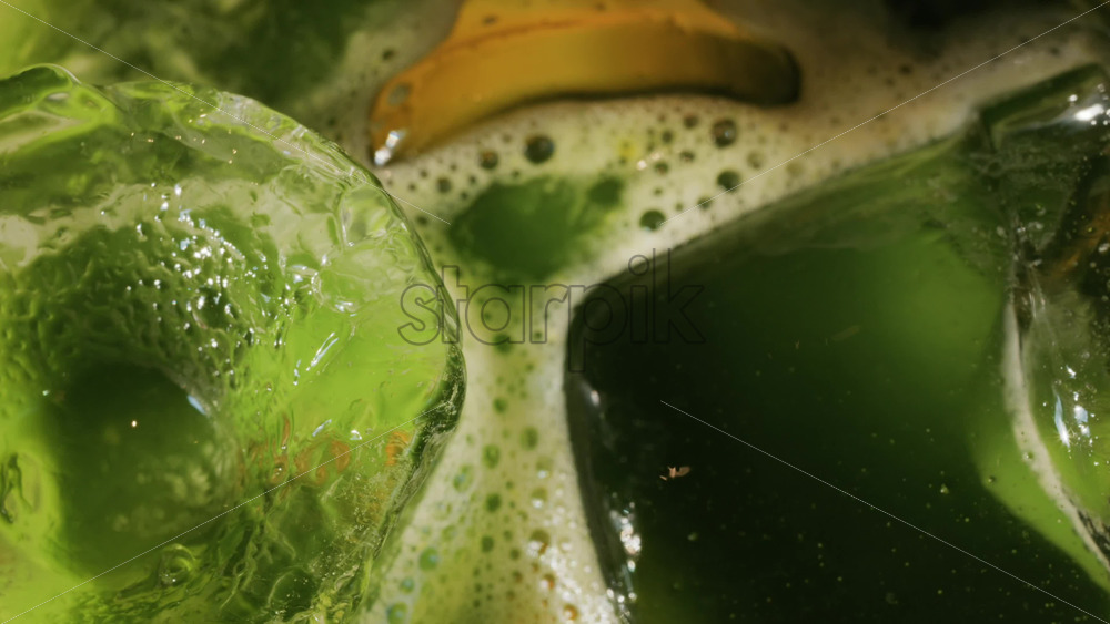Close up of a glass of an iced orange juice matcha on a table at a cafe. Vertical Royalty Free Stock Video Footage