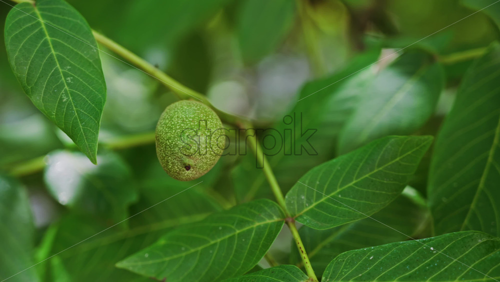 Close up of a green greek walnut surrounded by leaves on a tree Royalty Free Stock Video Footage