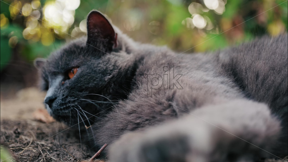 Close up of a grey cat with orange eyes lies on the ground in natural light Royalty Free Stock Video Footage