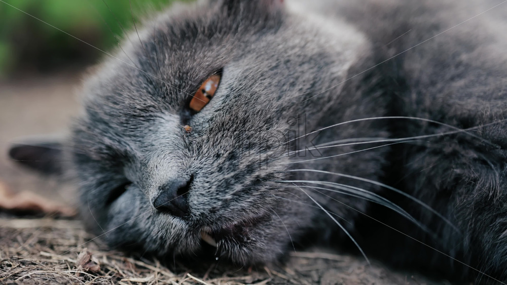 Close up of a grey cat with orange eyes lies on the ground in natural light Royalty Free Stock Video Footage