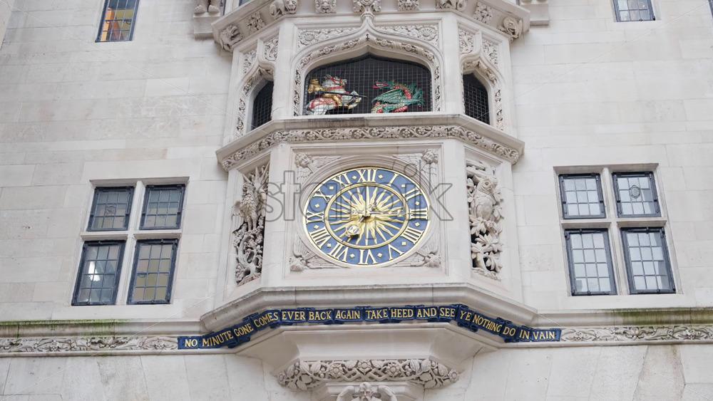 Close-up of a decorative black and gold clock mounted on a historic stone building in London, England Royalty Free Stock Video Footage